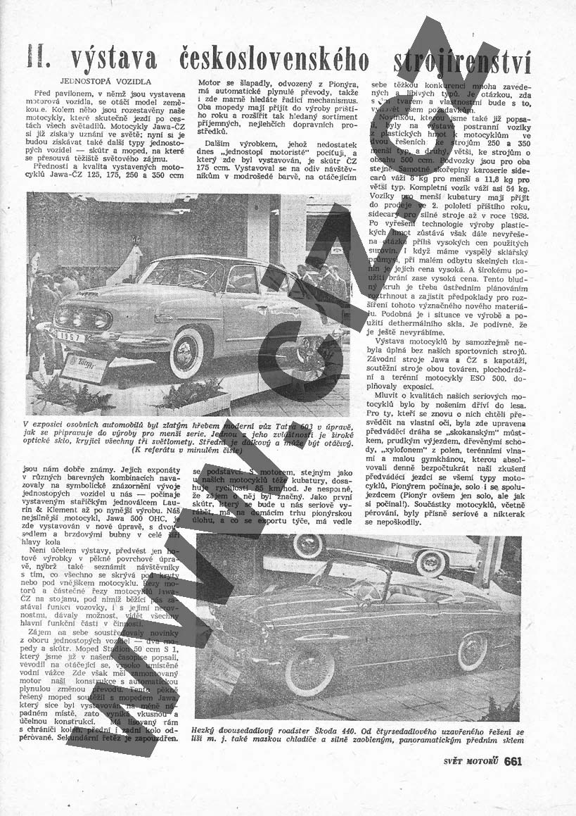 ![]() | Jednou z mnoha novinek na výstavě československého strojírenství v Brně byl tento kabriolet Spartak, který si v ničem nezadá se zahraničními vozy... |